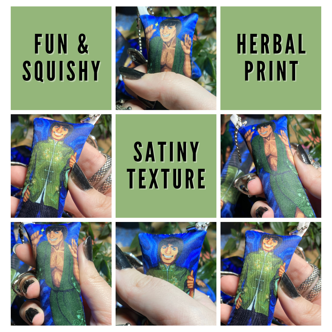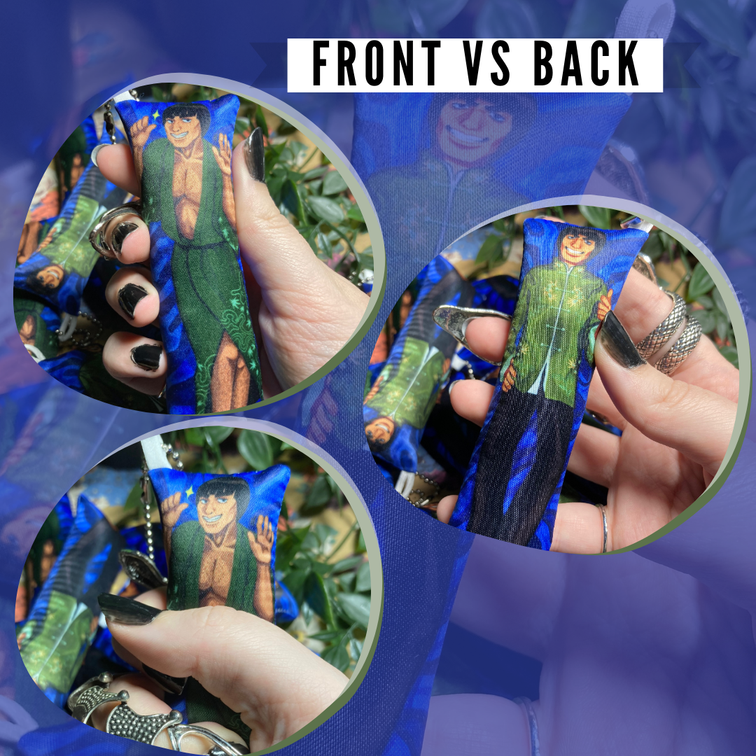 This is a polyester body pillow keychain that measures about 4"x1.5". It's stuffed with polyester filling, and has a "ball chain" style attachment.
