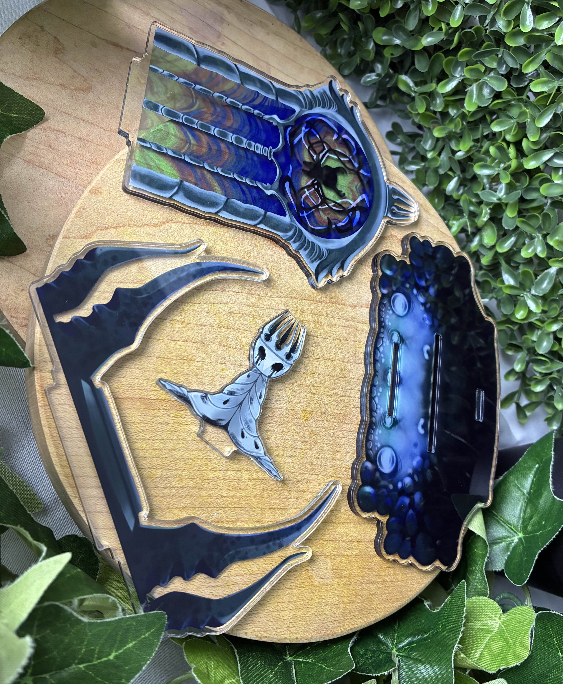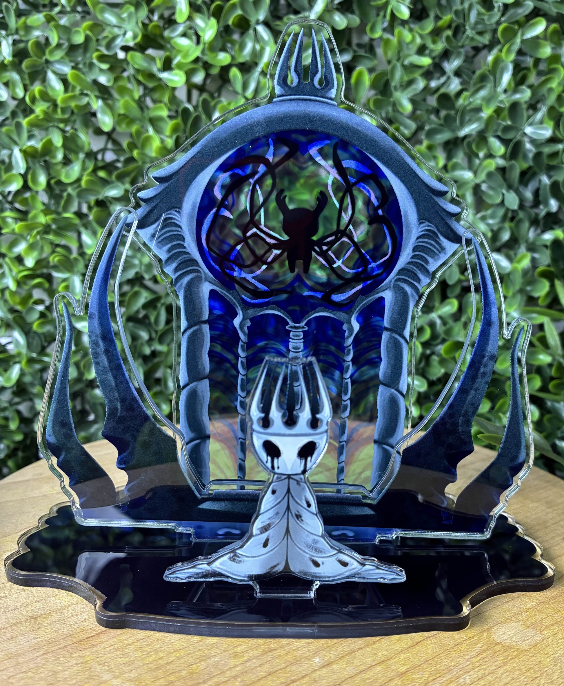This is an acrylic standee measuring ~5.5" for the height and ~5" wide and comes with three insertable pieces. Each piece is fully reversible, and the stained glass windows are somewhat transparent!