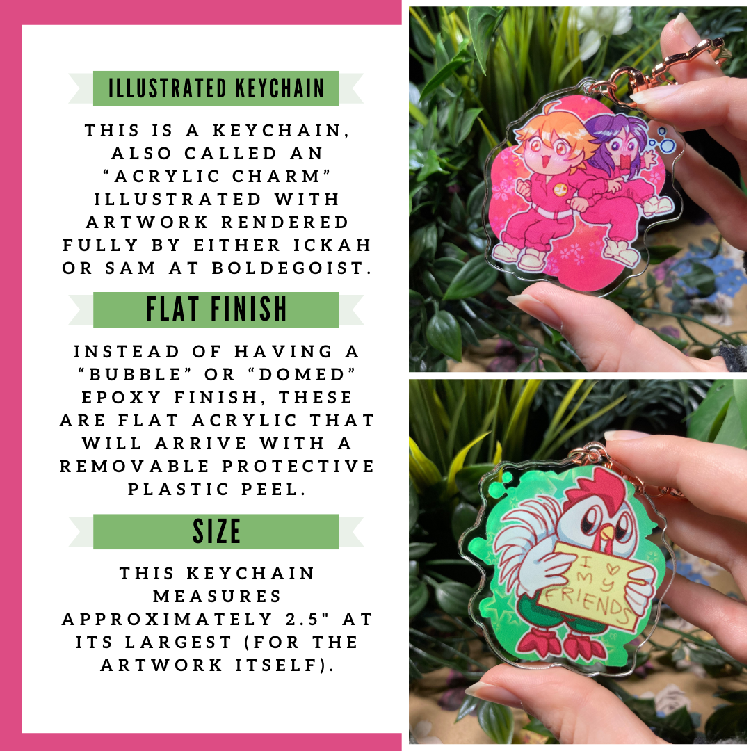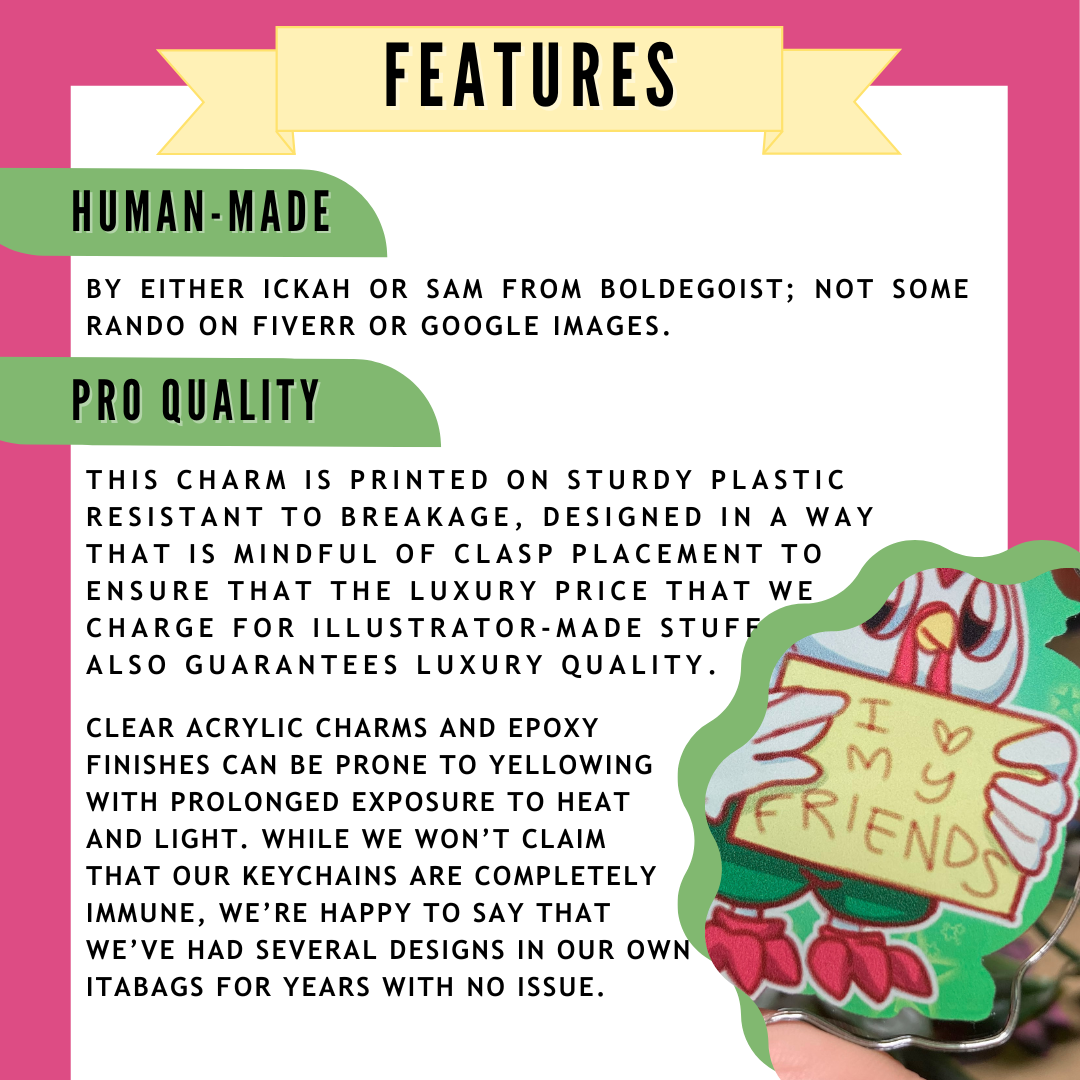 Acrylic charms are made of plastic, which means that they are waterproof but somewhat vulnerable to scratching. The epoxy coating turns it from artwork to functional artwork - it has some durability, but still needs a level of respect.